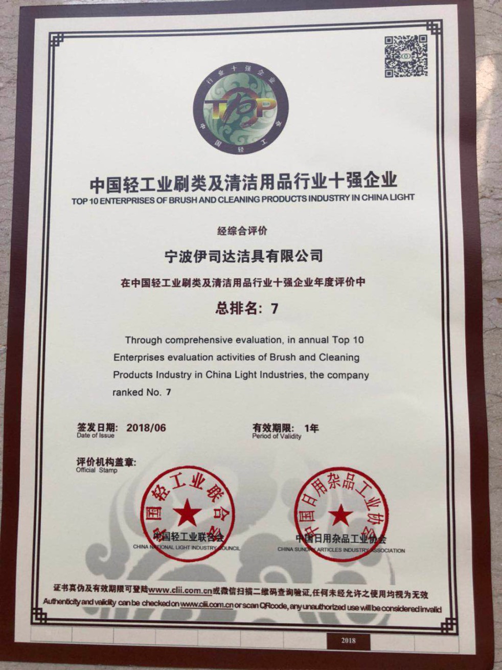 2018年7月9日,中國輕工業及清潔用品行業十強企業榜單在廣州揭曉,寧波伊司達潔具有限公司位列榜單,在輕工行業中競爭力優勢明顯。